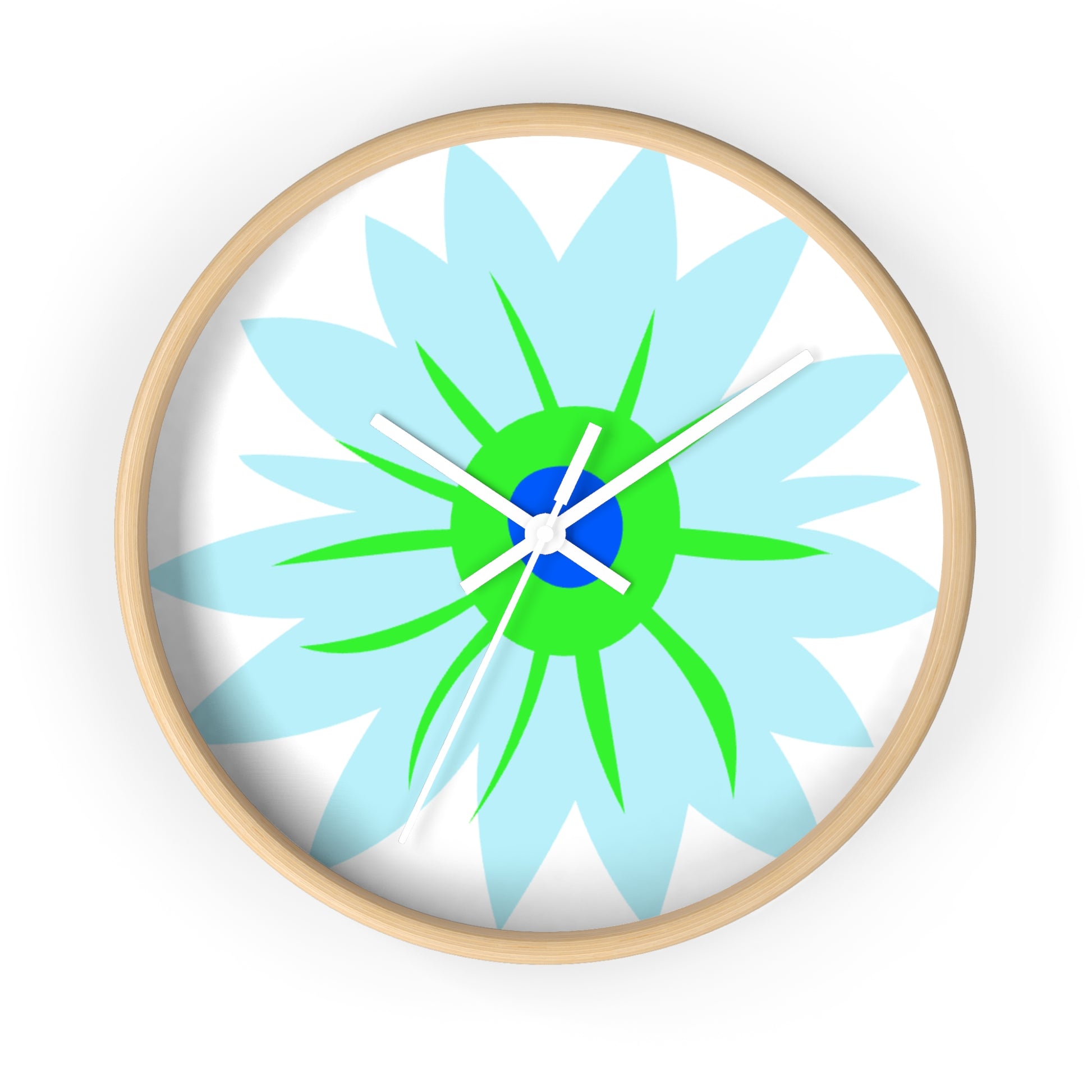 A bright, modern wall clock that brings a splash of fresh color to any room. The face features a stylized floral burst in cool aqua and lime tones, printed with vivid, fade-resistant inks on durable plexiglass. The slim wooden frame and silent metal movement create a calm, natural presence—no ticking, just smooth sweeping hands. Easy to hang with a pre-installed hook and runs on a single AA battery, this clock adds a lively, contemporary accent to kitchens, home offices, nurseries, or creative studios.